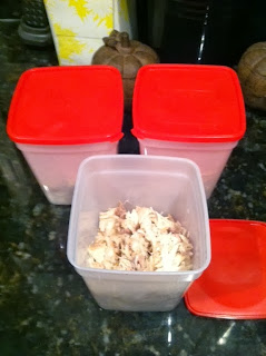 8. This one chicken yielded 6 cups of shredded chicken. (I did this after I got home from spin class and then started the stock.) So, I packaged it and labeled it for chicken pot pie, pre-measured into 2 cup servings. Menu planning for the season, not just week, allows you to know the quantities you will need. Package the way you want to cook.****Begin the way you want to end to make this whole process work.****